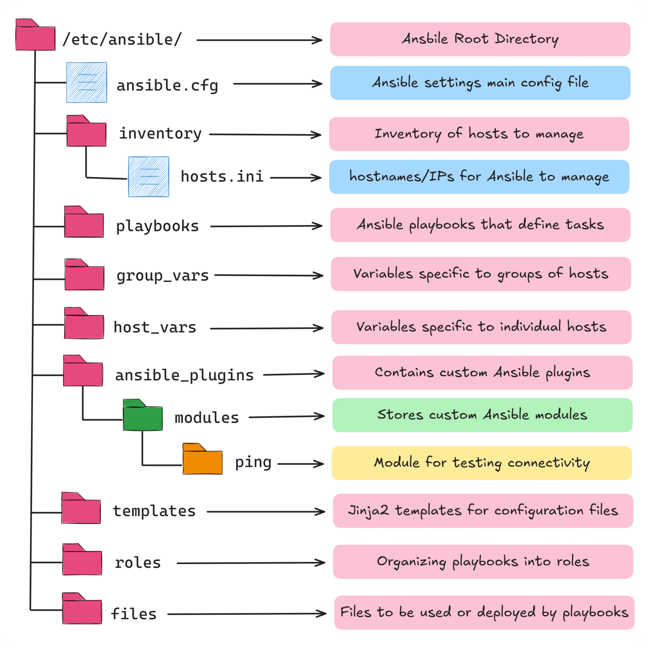 ansible.cfgand manages hosts viahosts.iniunder theinventorydirectory.Once you run the ping module, Ansible references this structure, ensuring the configuration and host details are in place.