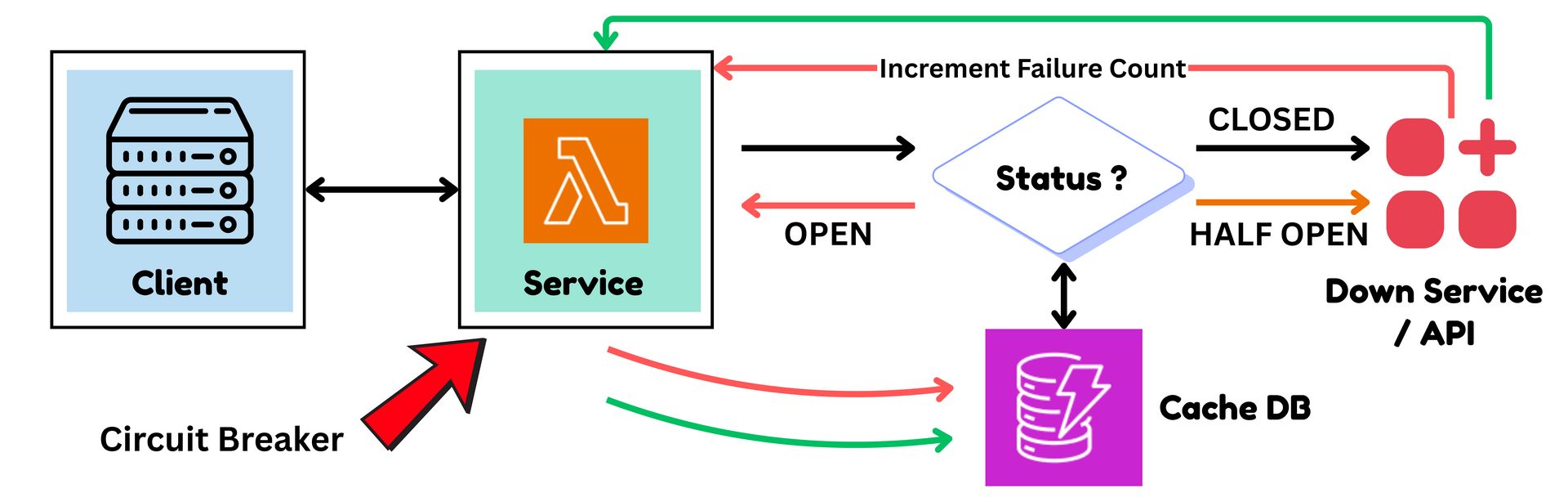It works similar to an electrical circuit breaker. When the downstream system is healthy, calls flow normally. When it becomes unhealthy and errors reach a threshold, the breaker trips open to stop more calls from being sent.