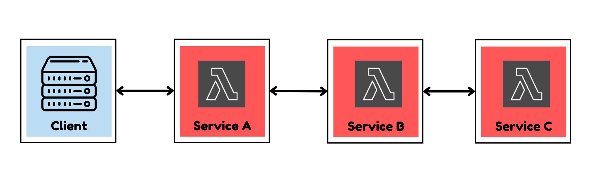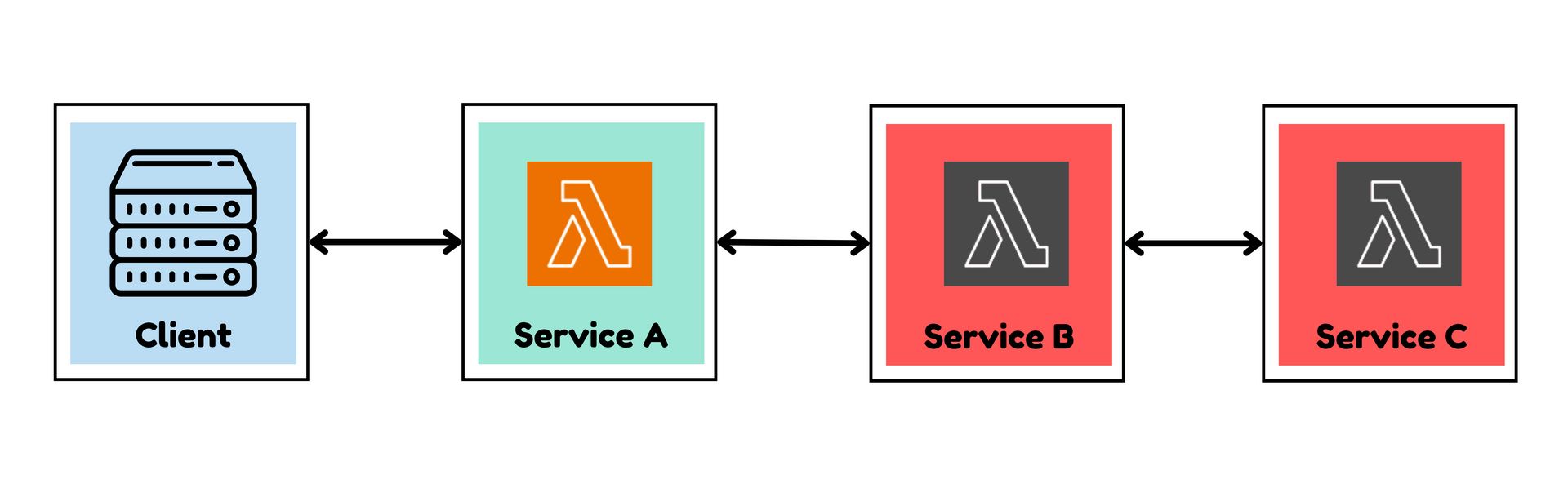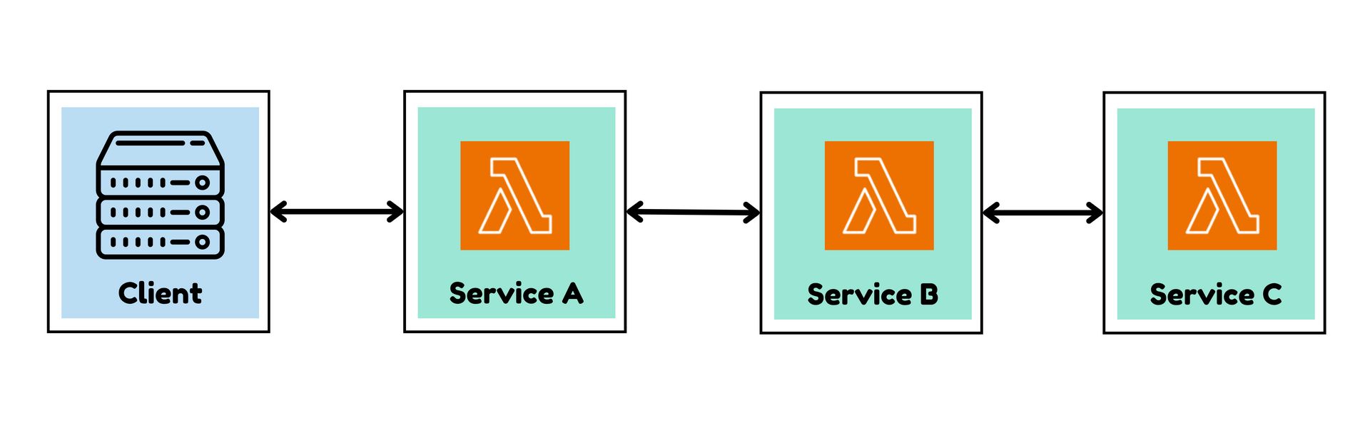 Imagine you are running a serverless application on AWS. A client request flows through Service A → Service B → Service C, each backed by AWS Lambda.