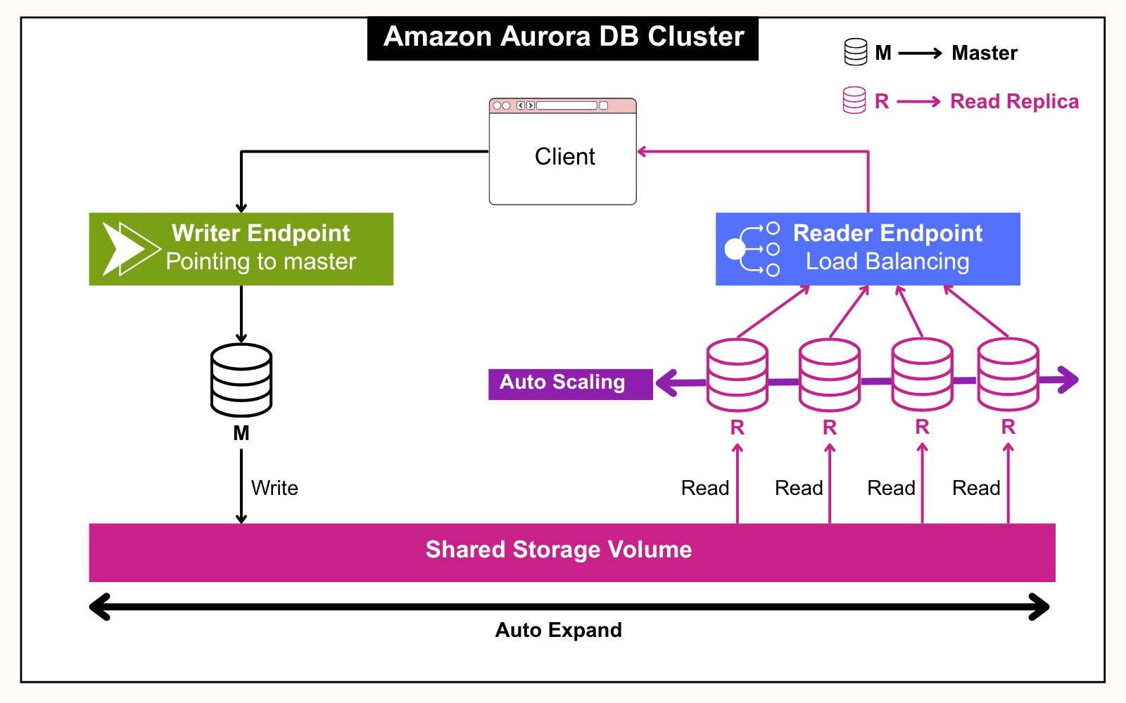 Aurora has a single writer node (the master) and supports up to 15 Aurora read replicas to scale reads. All nodes share the same backend storage, which eliminates the need for data copying during replica creation or failover.