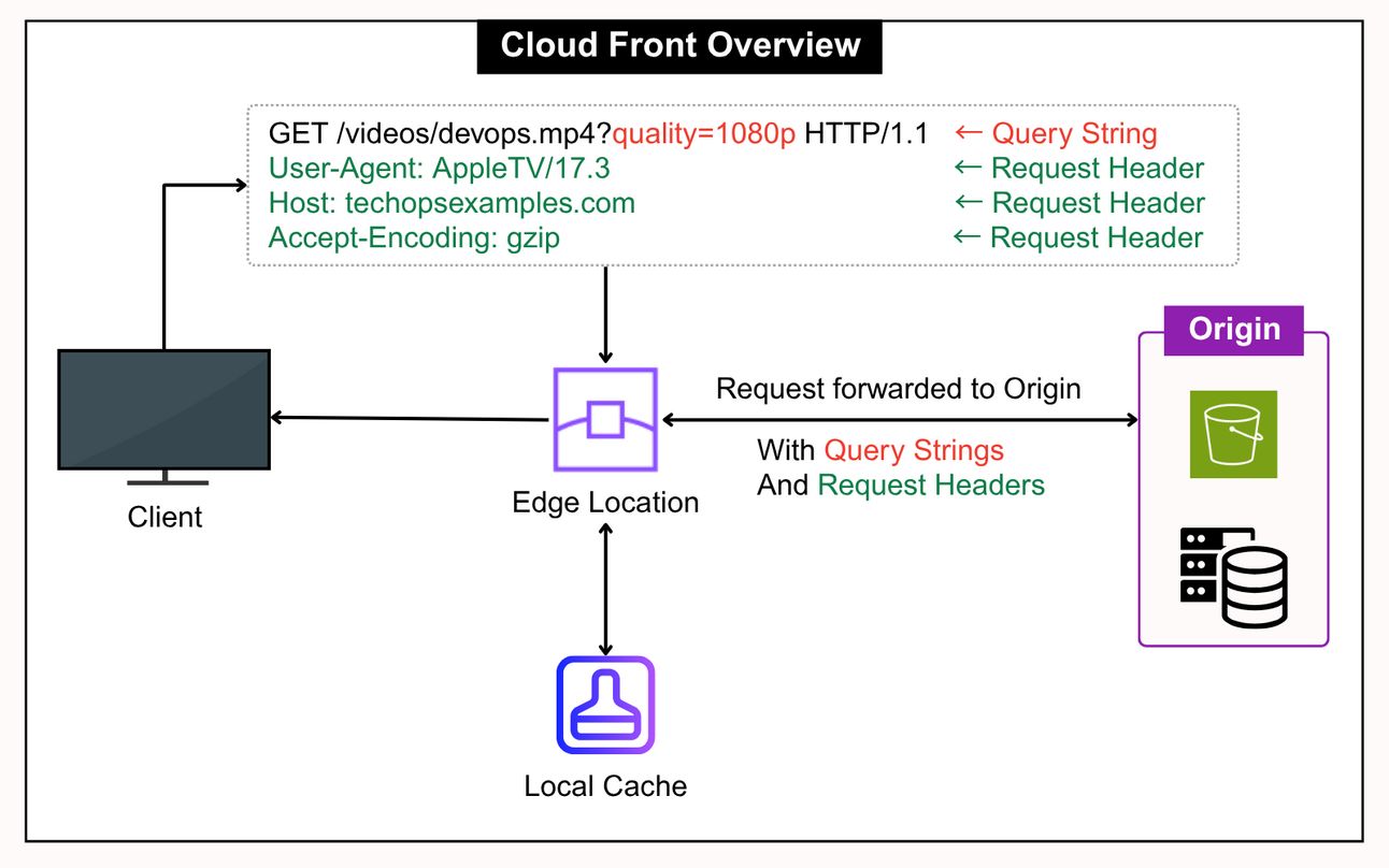 When a client sends a request, CloudFront checks the edge cache using the full HTTP request details. This includes the request path, query strings like ?quality=1080p, and headers such as User-Agent, Host, and Accept-Encoding.