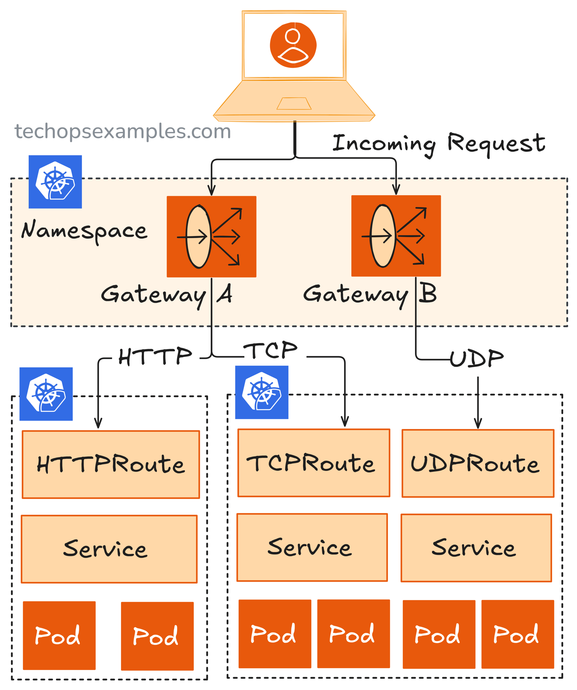 HTTPRoute,TCPRoute, andUDPRouteresources. This allows you to define traffic rules beyond just HTTP(S).Namespace scoped delegation: You can run multiple Gateways in the same cluster, each scoped to a namespace. making it ideal for multi tenant architectures.