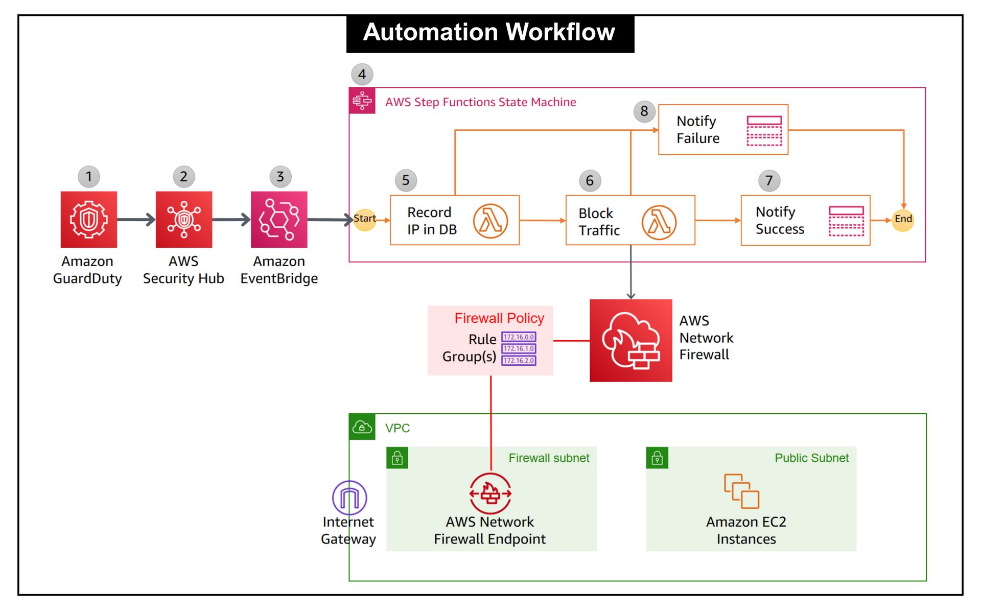 EventBridge starts a Step Functions workflow so every suspicious IP is handled the same way, without manual judgment during an incident.Record before blocking