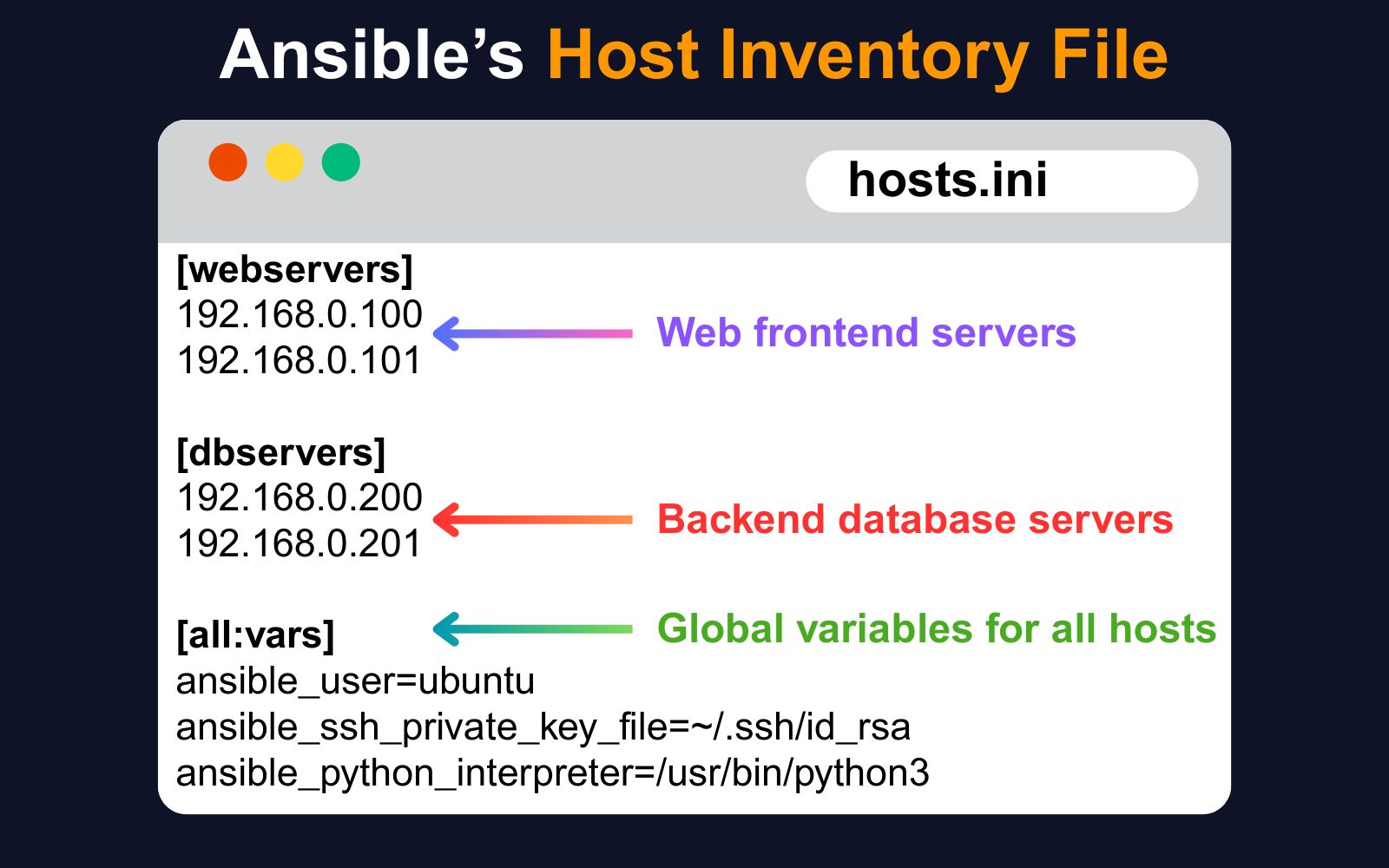 You can group servers by purpose, like webservers or databases. The [all:vars] section defines values that apply to every host, like the SSH user and key.