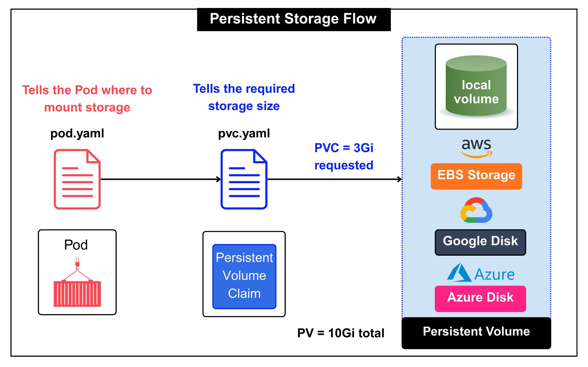 The storage can be local disk, NFS, or cloud storage like AWS EBS, GCP Disk, or Azure Disk.