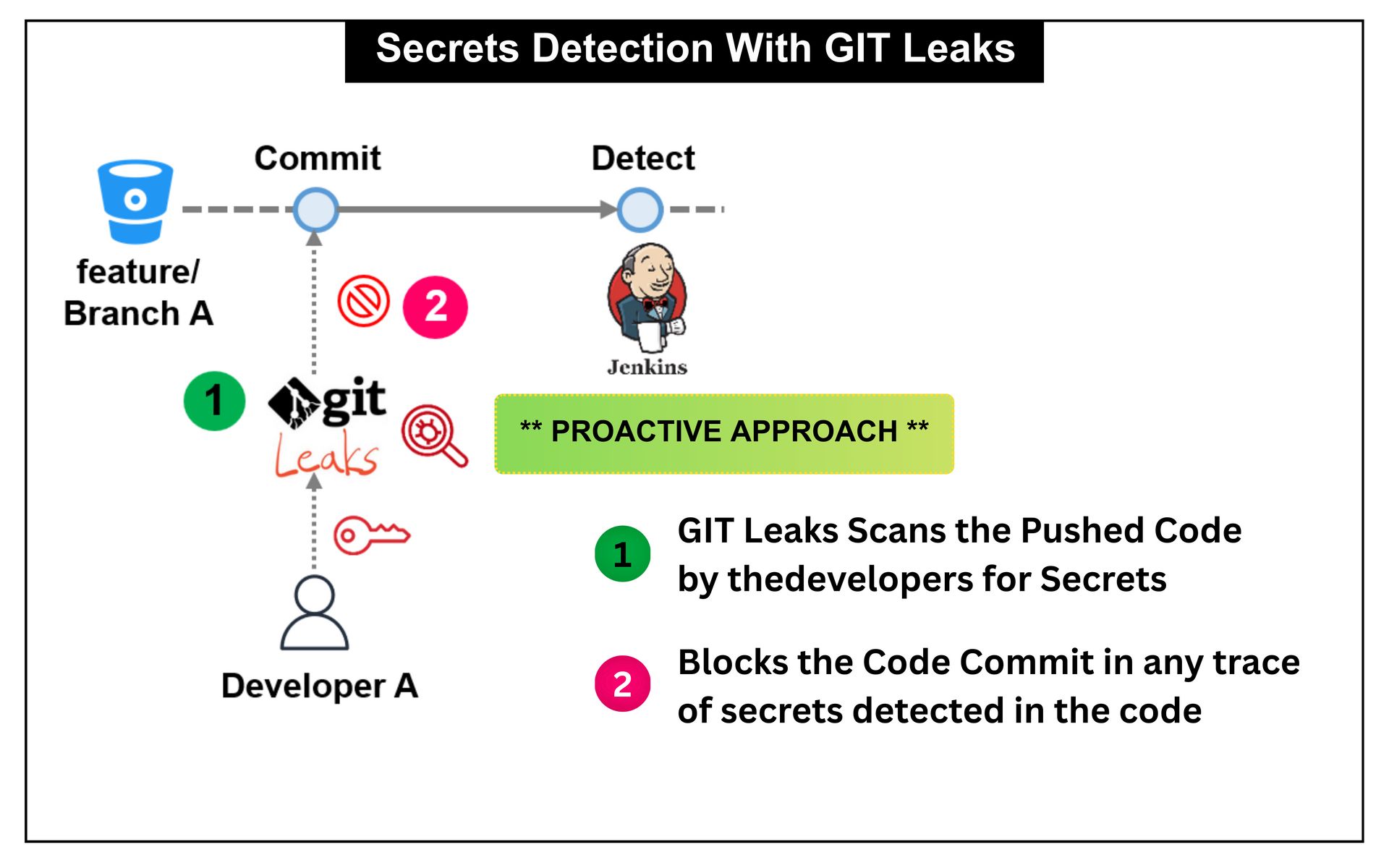 Pre-commit hooks: GitLeaks scans the code for secrets before any commit is made. If a secret is found, the commit is blocked, ensuring it never reaches the repository.