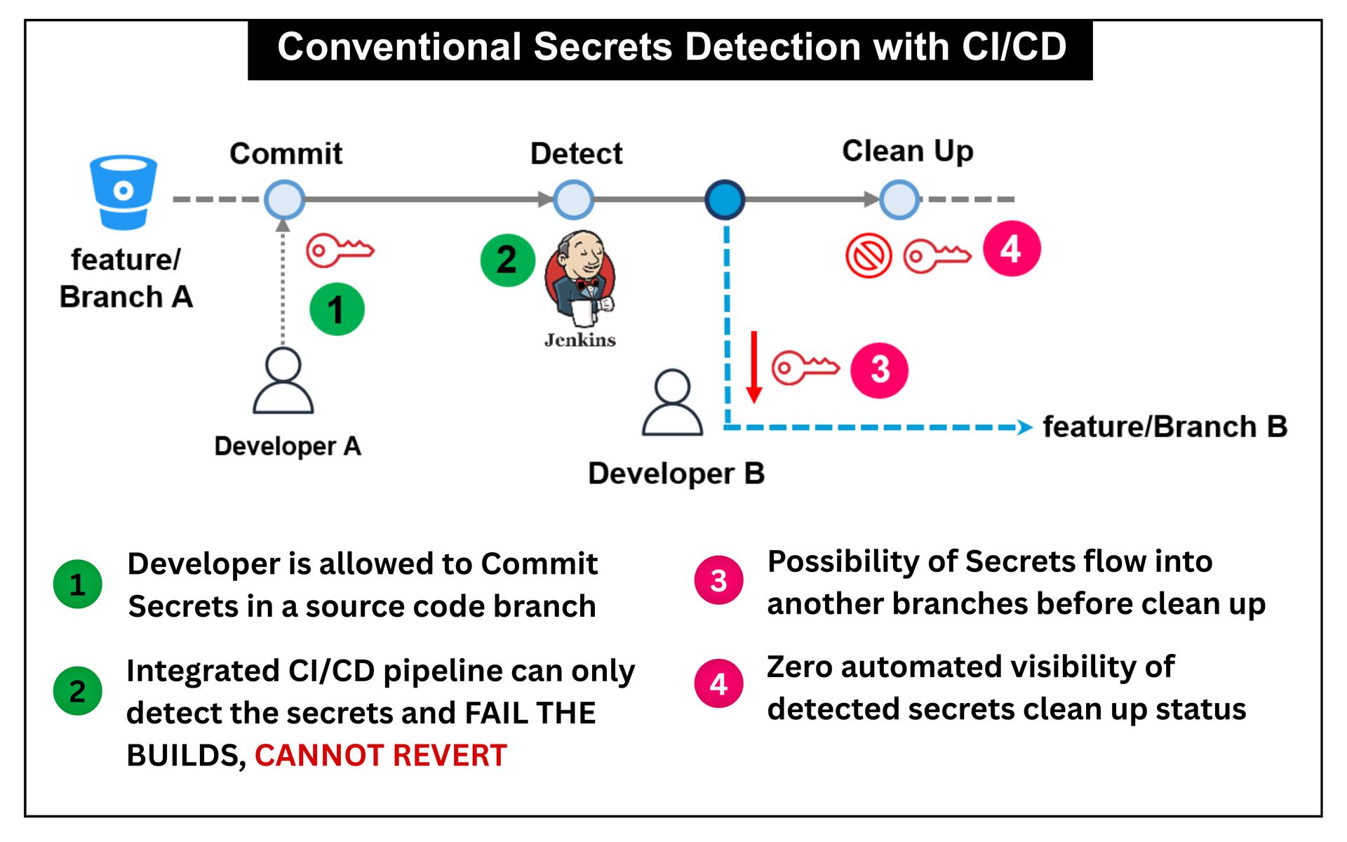 This is completely a reactive approach. Even if secrets are detected and cleaned up eventually, there may still be a time window where exposed secrets could be exploited, leading to security breaches, misuse of sensitive data, or unauthorized access.