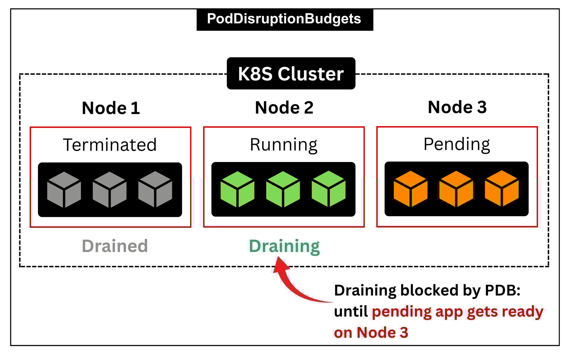 In the above example, Kubernetes is trying to drain Node 2. However, the PodDisruptionBudget prevents it from doing so because the new pods scheduled on Node 3 are still in the Pending state.