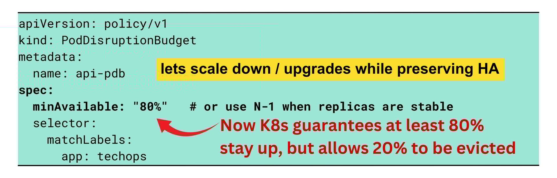 For example, setting minAvailable: "80%" tells Kubernetes to always keep at least 80 percent of the pods running, while allowing up to 20 percent to be stopped when needed.