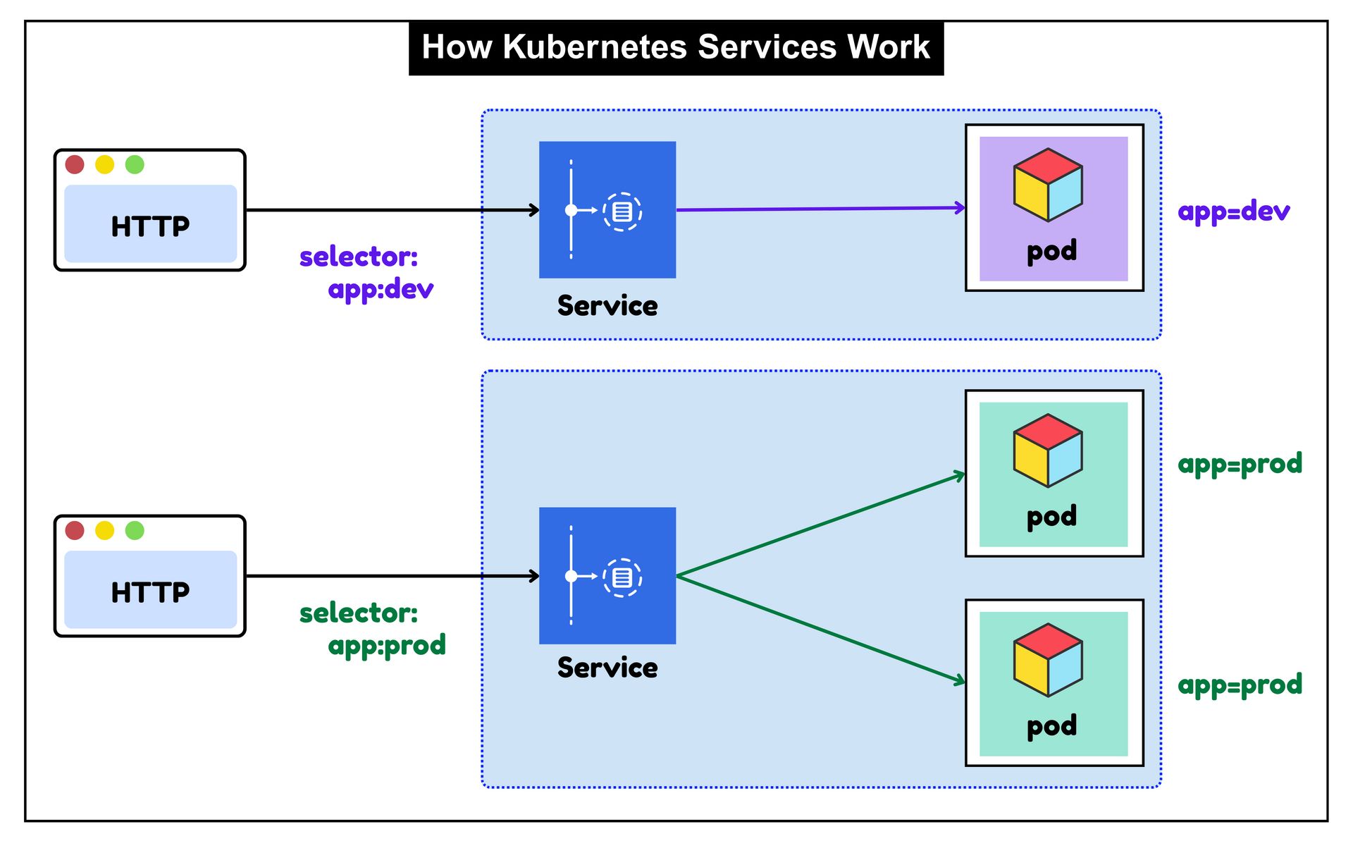 This is why traffic flows only to pods marked app=prod, while the app=dev pod remains isolated.