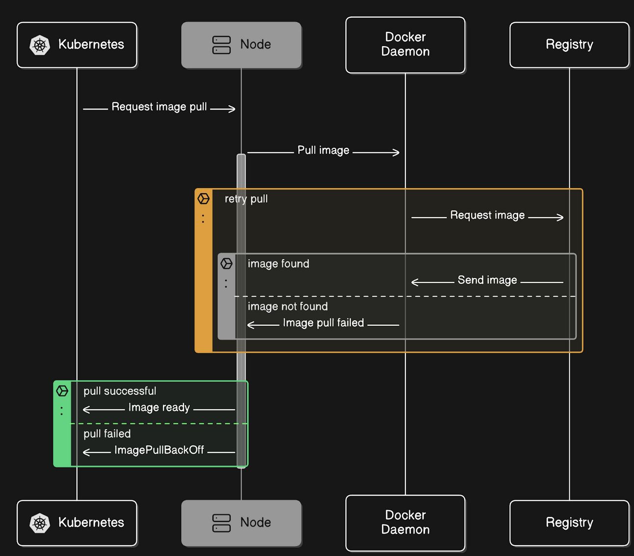 If the retry fails, Kubernetes enters ImagePullBackOff state, preventing further retries.