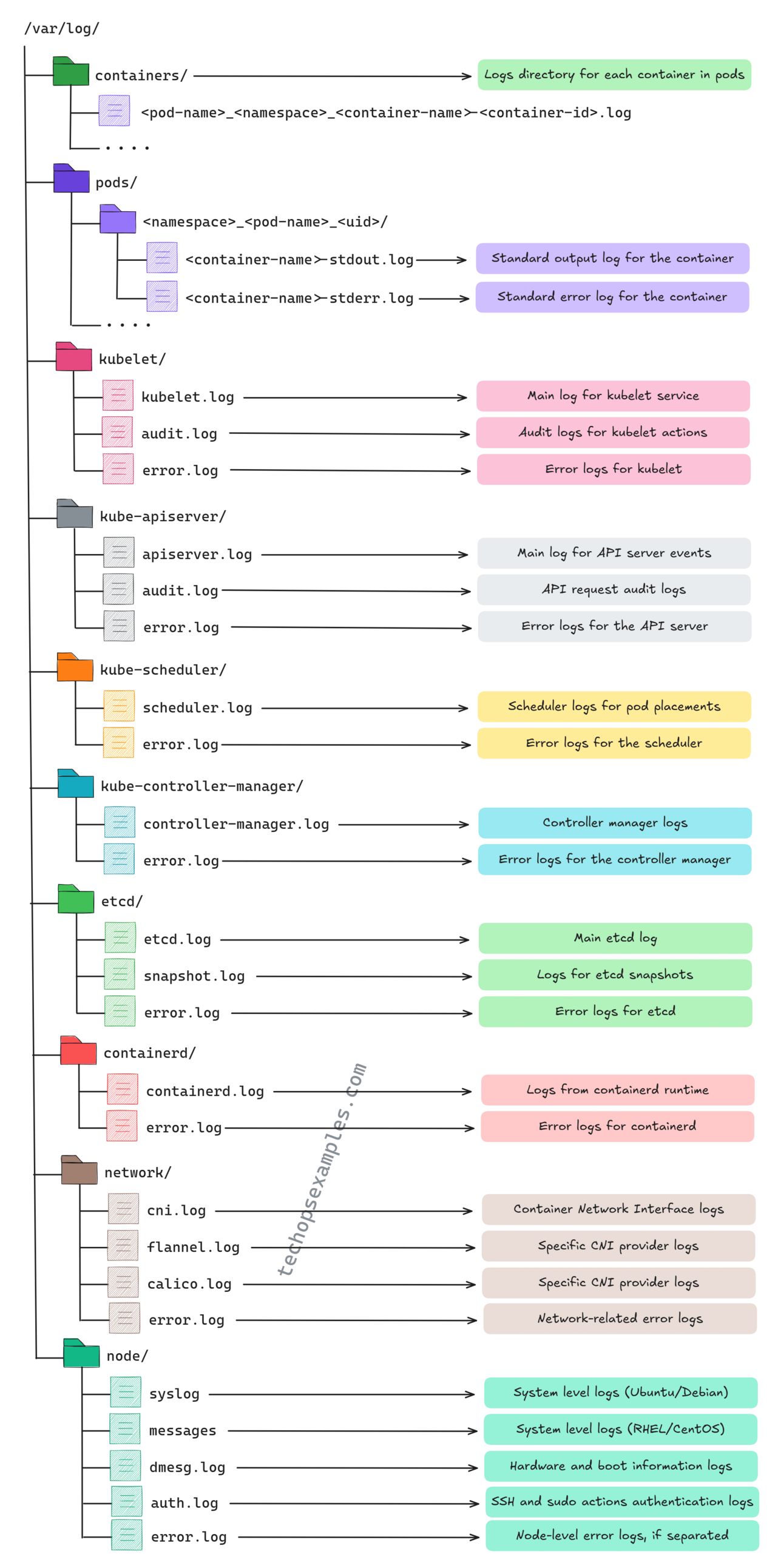 First I have shared a table that outlines the main Kubernetes log types their file paths and what each one means.