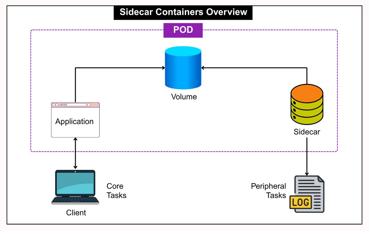 Sidecars run alongside your app container and stay alive throughout the pod lifecycle. They share volumes and network with the app and are designed to offload operational work.