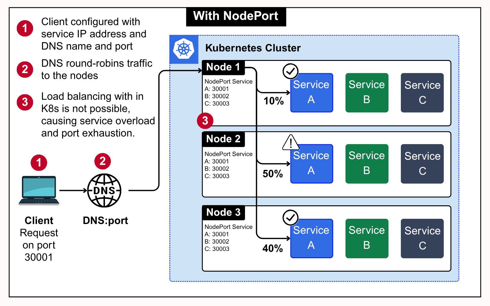 NodePort isn’t real load balancing. DNS round robin may seem like a distribution method, but it doesn’t account for node health or service level metrics. If one node is overloaded or down, traffic still gets routed to it.