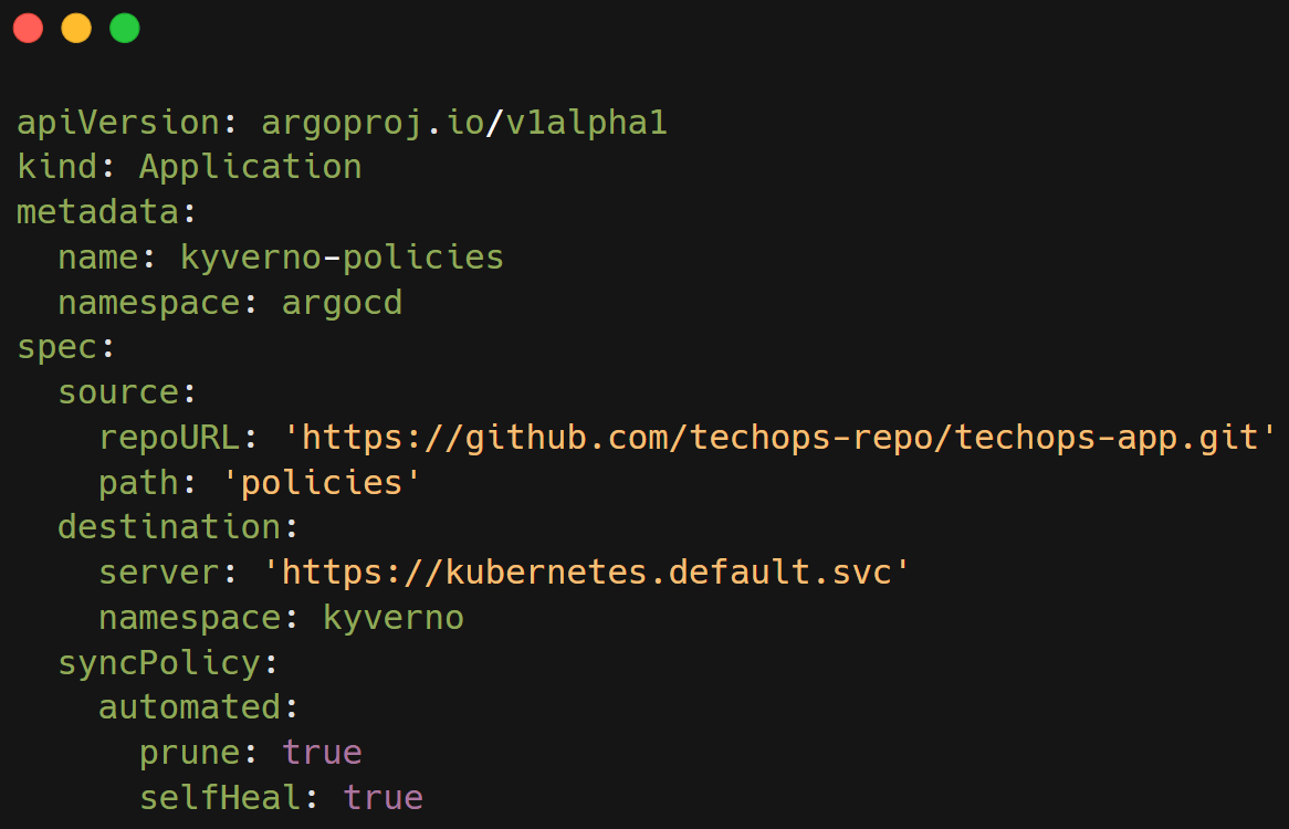 To integrate Kyverno policies into your GitOps workflow, create an ArgoCD application for policies: