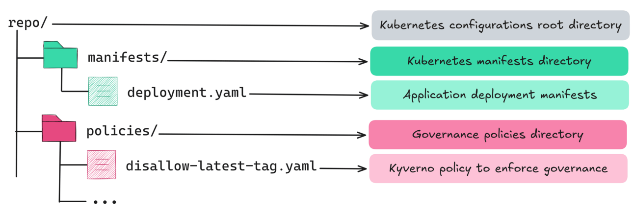 policies/: Contains Kyverno policies for version-controlled governance, applied during resource creation or updates.